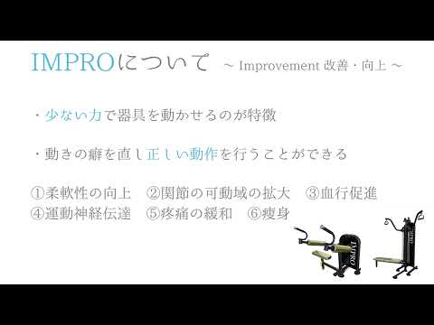 動的ストレッチマシン IMPRO(インプロ)は、筋肉を弛緩させ、その人なりの大きな可動域で力を抜いて反復運動することにより、上記の効果が期待されます。